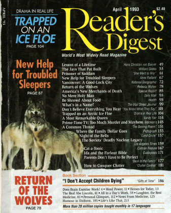 Another article about wolves; from Readers Digest. You may recognize the picture on the cover, I have seen it all over the Internet on many wolf related sites! Dated April, 1993. Condensed from CANADIAN GEOGRAPHIC. Written by Roberta Walker.